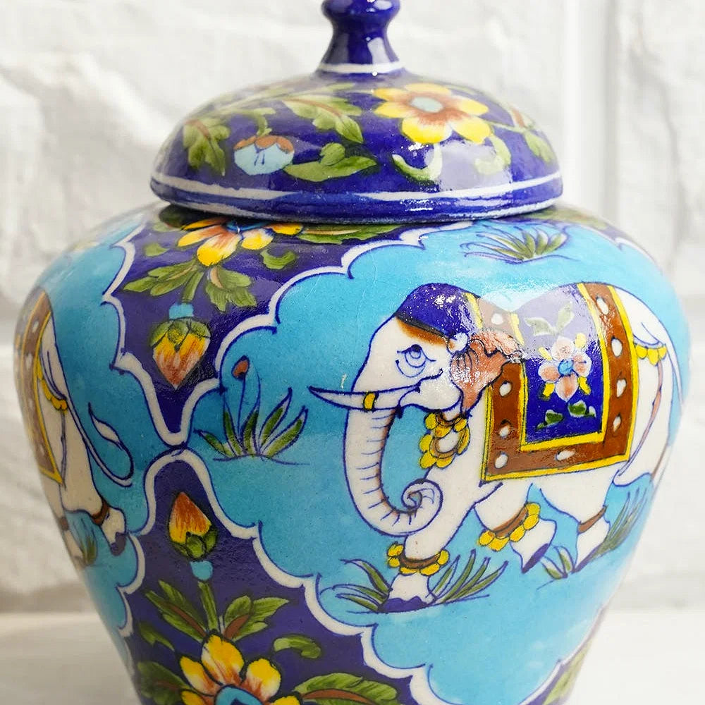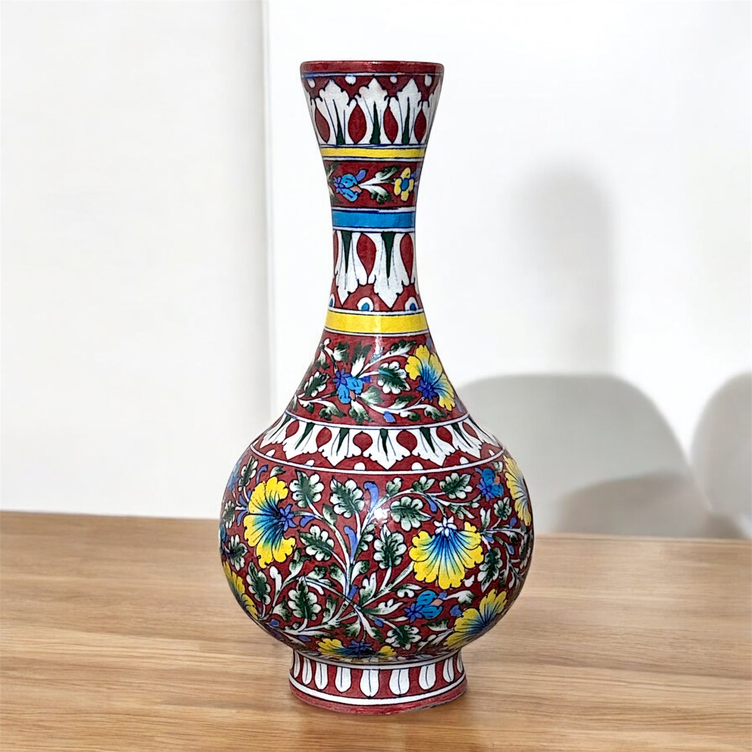This beautiful vase from Aditya Blue Art Pottery is a true work of art. Handcrafted using traditional Blue Pottery techniques, it features vibrant floral patterns with a glossy finish. Each piece is unique, blending heritage and elegance to enhance your home décor.