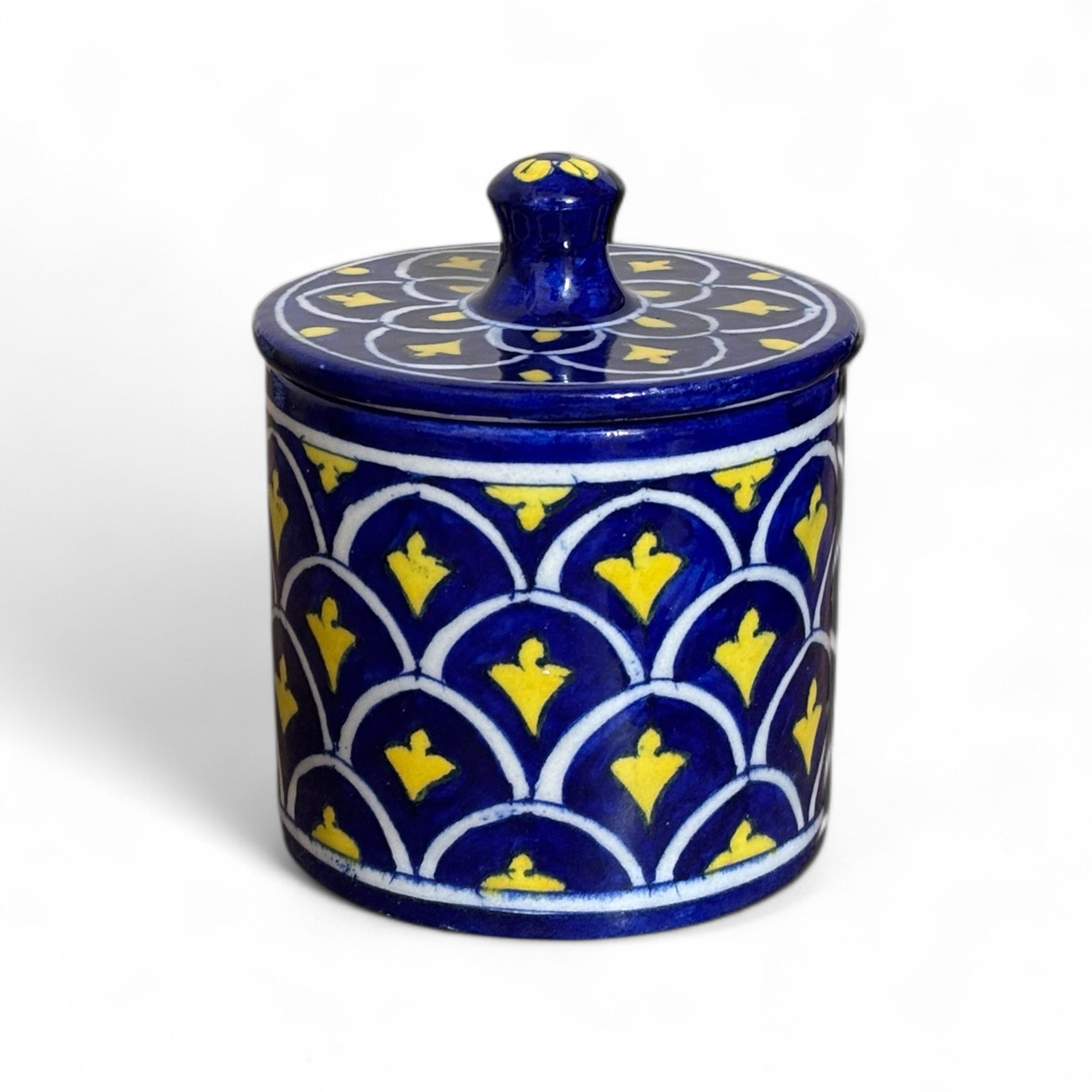 Add a touch of timeless charm to your kitchen or living space with this beautifully handcrafted blue pottery storage jar. Featuring an elegant royal indigo blue pattern with vibrant yellow floral accents, this jar is perfect for storing spices, dry fruits, sugar, tea, or even small keepsakes. The intricate hand-painted design and smooth glazed finish make it a stunning addition to any shelf or tabletop.