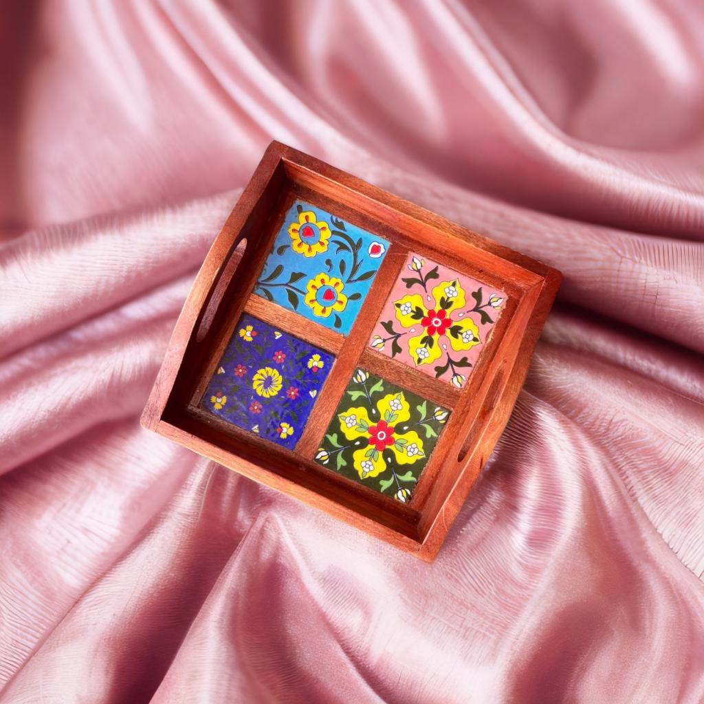 Crafted in traditional blue pottery style, this tray features four intricately hand-painted tiles. Made with high-quality materials, it adds a touch of elegance to any kitchen or dining room. Each tile is unique, making this tray a work of art as well as a functional piece.