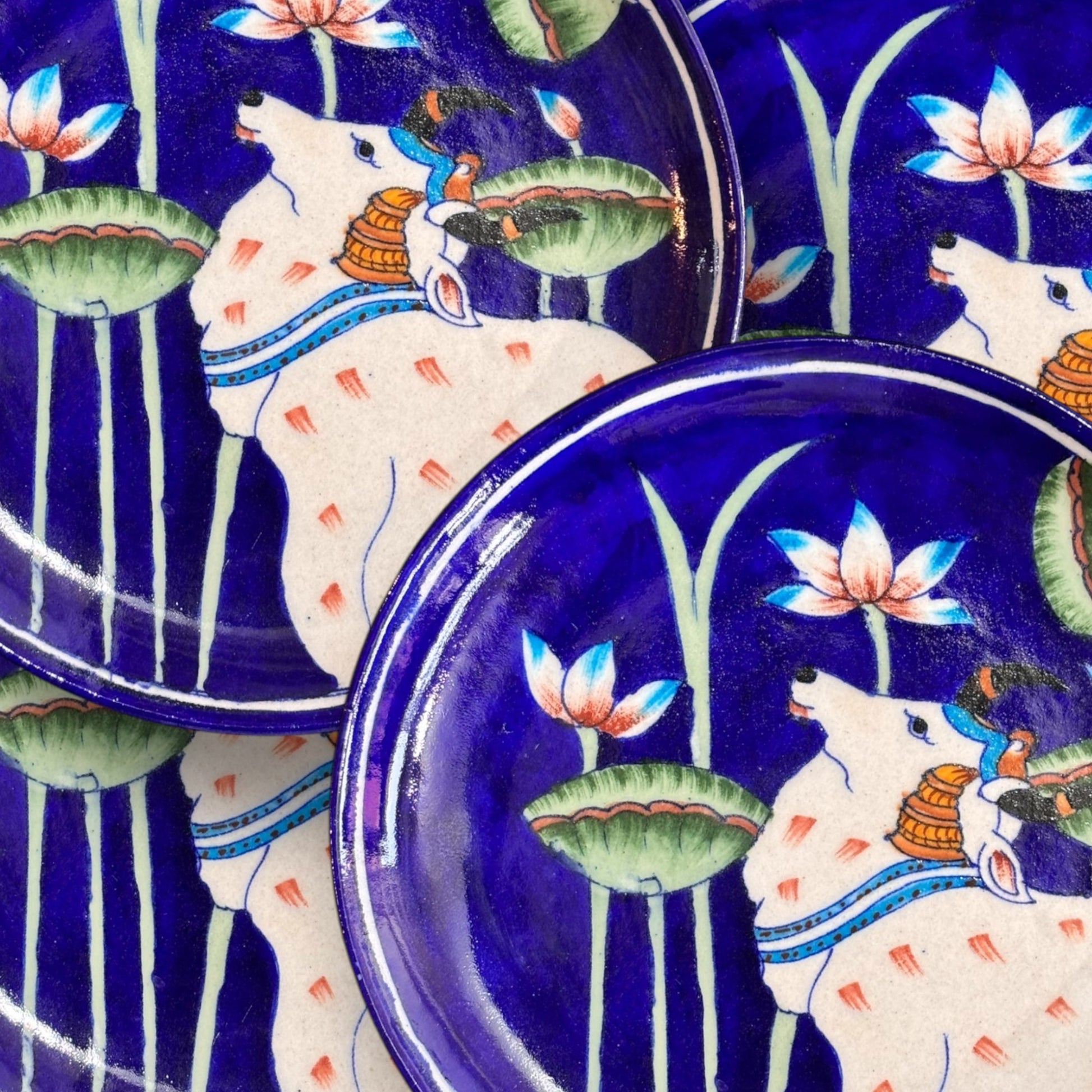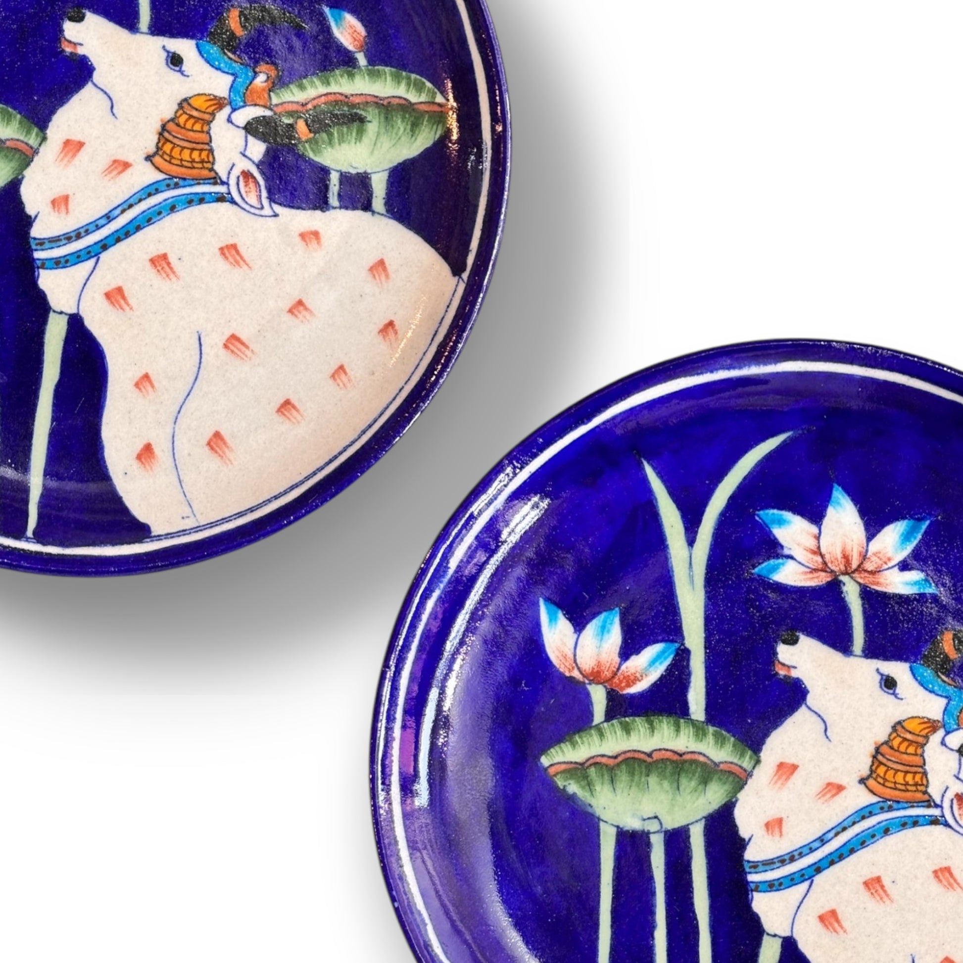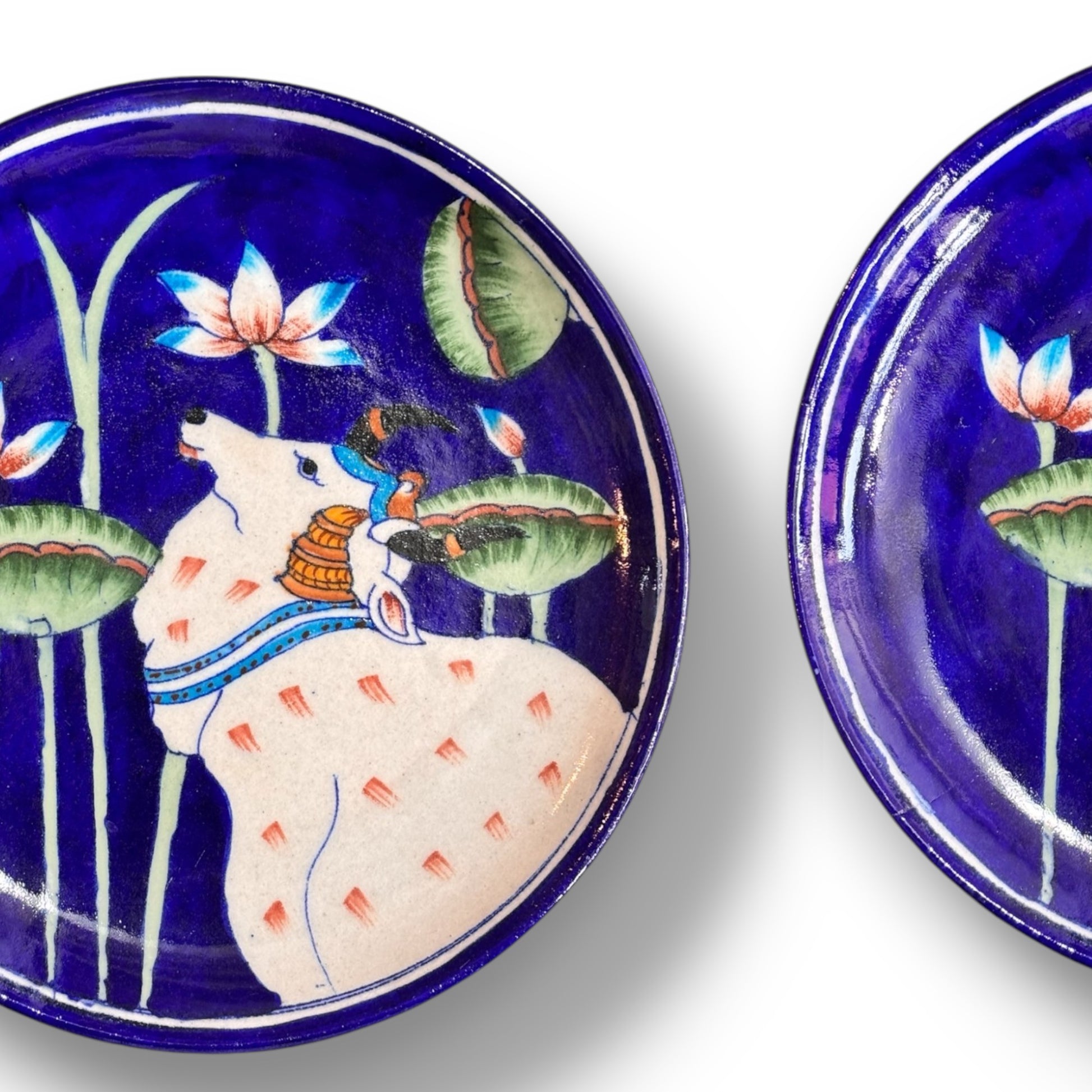 This 8-inch handmade wall plate showcases a striking cow design in rich royal blue, crafted using traditional Blue Pottery techniques. Its vibrant color and detailed artistry make it an elegant decorative piece, perfect for adding cultural charm and a touch of sophistication to any interior space. Durable and unique, it reflects expert craftsmanship and timeless appeal.